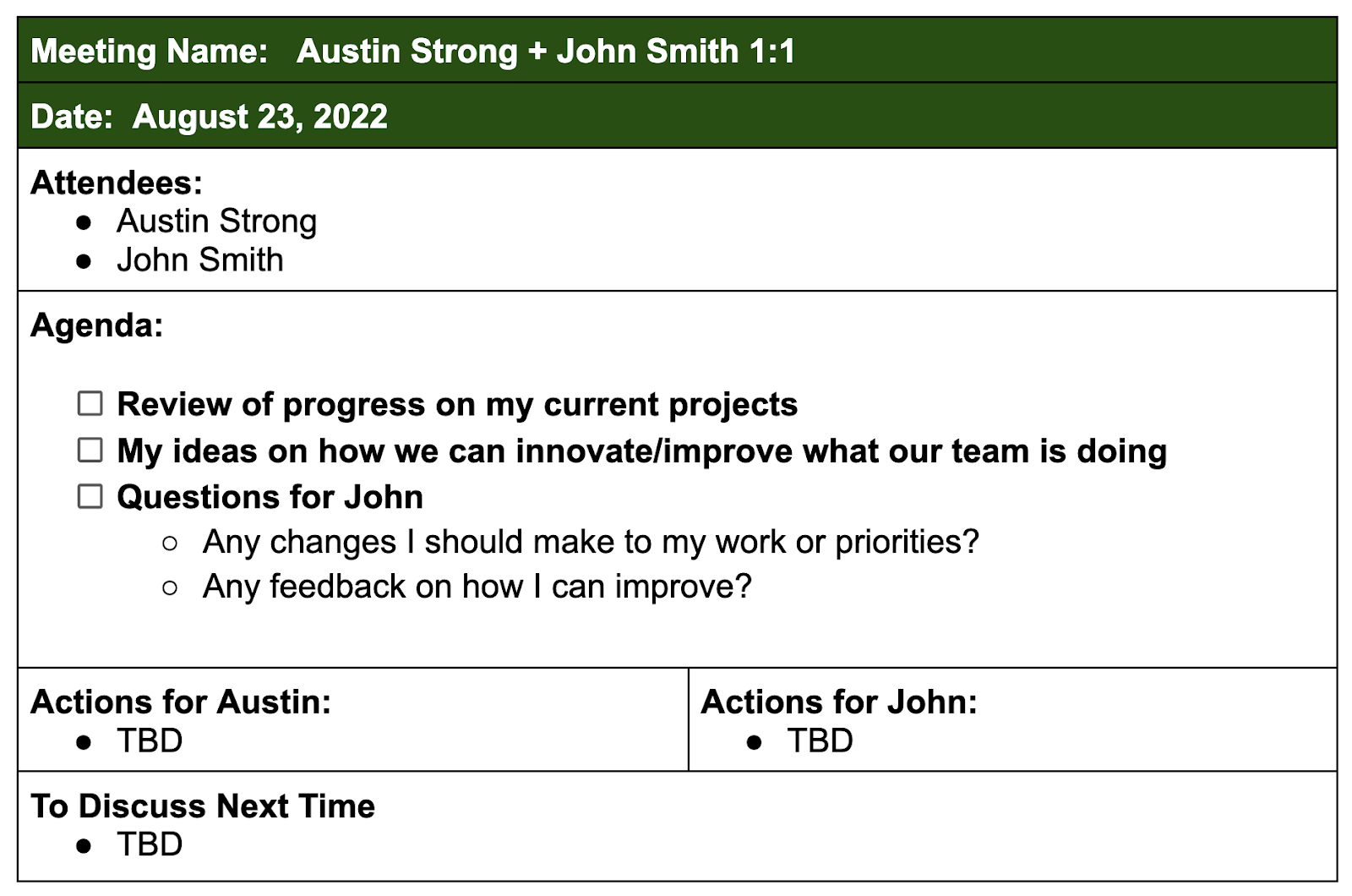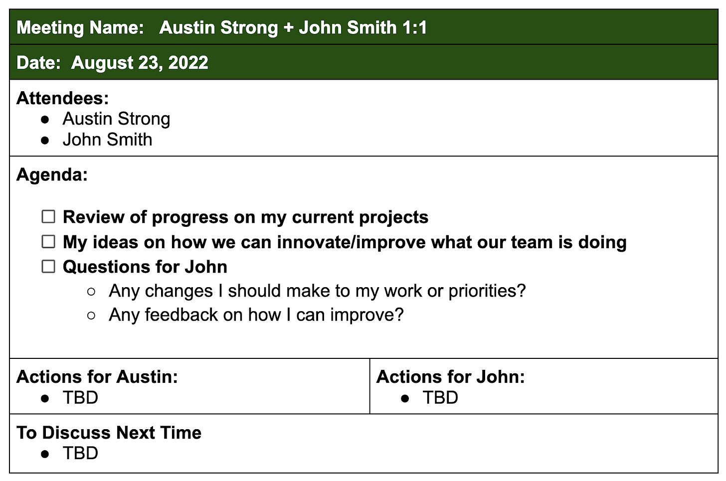 Last word on this: You should prep an agenda for your 1:1 meeting. It doesn’t work well to just show up and hope your manager asks “how are you doing?” Rather you want to “manage up”. Be in control of the conversation. Make it easy for your boss to cover all the topics you care about discussing. Best practice is to send the agenda to your manager ~24 hours in advance so they know what you want to talk about and can put some thought into it vs. just answering on the fly. Here’s an example of what I send to my manager before our weekly 1:1