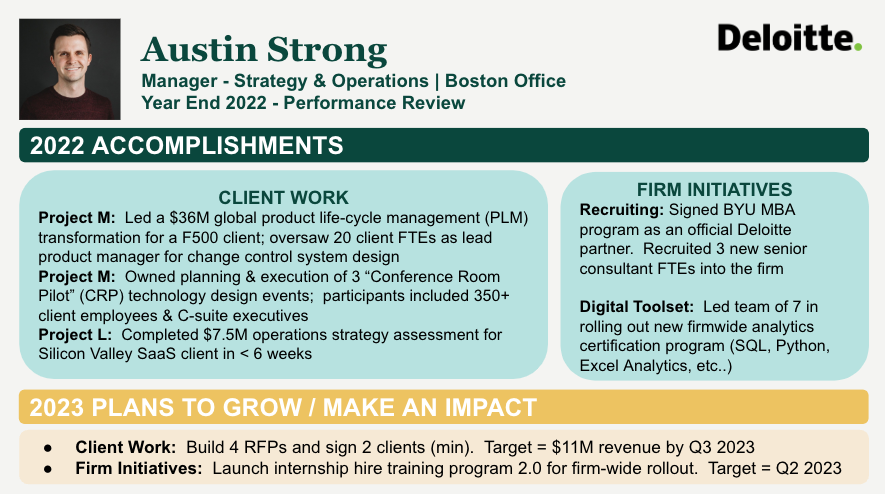I recognize this idea may not appeal to everyone, but in my experience it was the cherry on top that made a big difference when being considered for salary increases or promotions. It was well worth the ~1-2 hours I’d spend putting it together each YE.